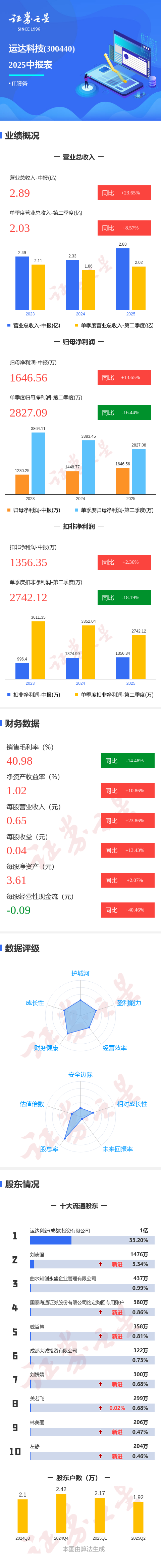 证券之星音书,运达科技2025年中报显现,公司主营收入2.89亿元,同比飞腾23.65%;归母净利润1646.56万元,同比飞腾13.65%;扣非净利润1356.35万元,同比飞腾2.37%;其中2025年第二季度,公司单季度主营收入2.03亿元,同比飞腾8.58%;单季度归母净利润2827.09万元,同比下跌16.44%;单季度扣非净利润2742.12万元,同比下跌18.2%;欠债率29.78%,投资收益144.46万元,财务用度109.59万元,毛利率40.98%。