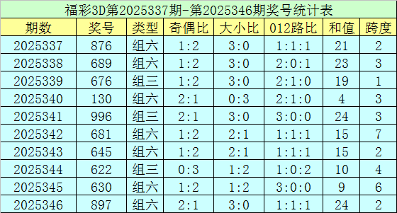 上期总结:福彩3D第2025346期开奖号码为897,组选类型为组六,奇偶比为2:1,大小比为3:0。